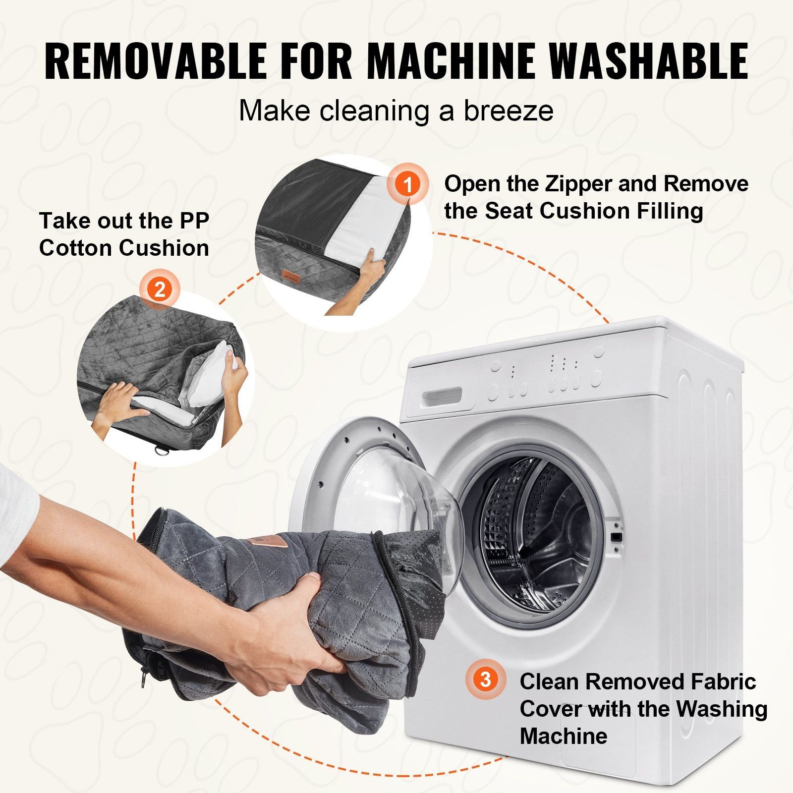 4.Easy to Clean: Designed for convenience, this puppy car seat has a fully removable cover and built-in sliding zipper. Take out the filling and the cover can be machine washed, making maintenance simple and hassle-free.